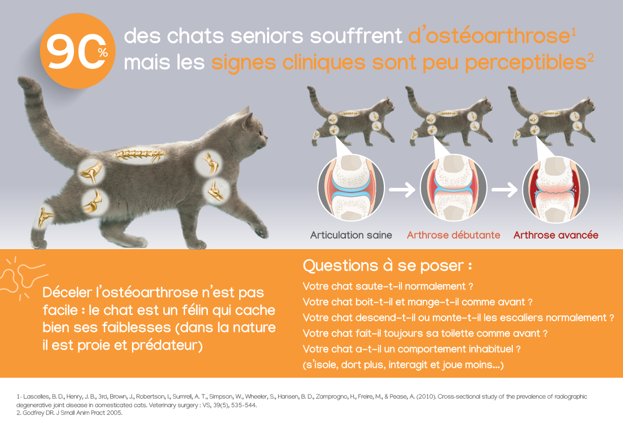 90% des chats de plus de 10 ans1 et 60% des chats de plus de 6 ans2 présentent des signes radiologiques de dommages articulaires. Pour autant, ils dissimulent habilement leurs faiblesses et manifestent rarement des symptômes en corrélation avec ces lésions.