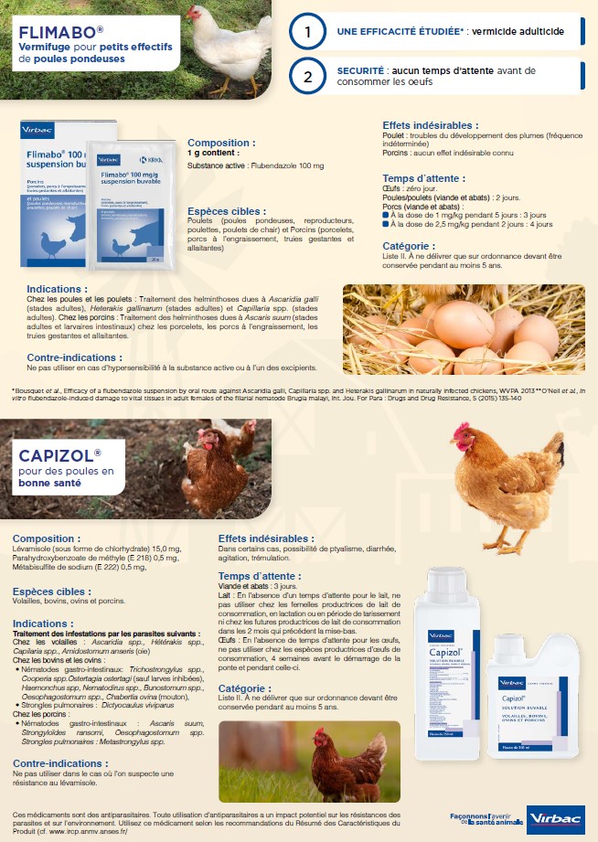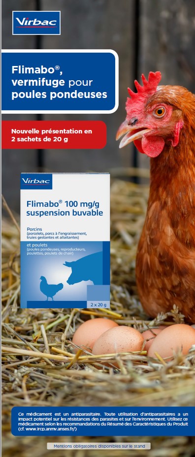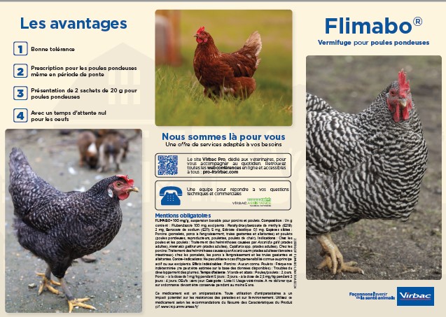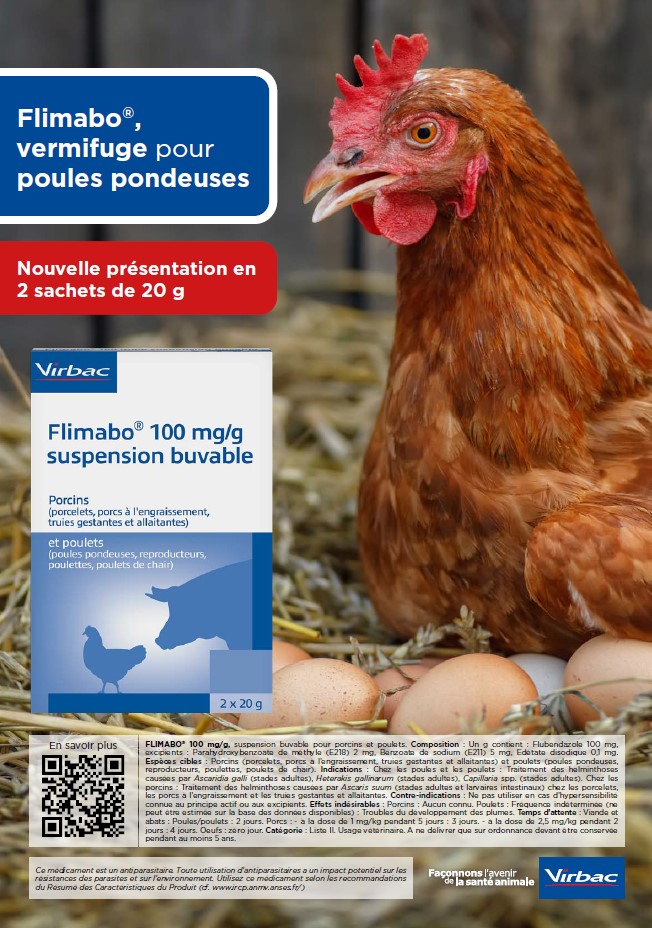 FLIMABO® 100 mg/g Suspension buvable pour porcins et poulets. Composition : Un g contient : Flubendazole 100 mg. Espèces cibles : Porcins (porcelets, porcs à l'engraissement, truies gestantes et allaitantes) et poulets (poules pondeuses, reproducteurs, poulettes, poulets de chair). Indications : Chez les poules et les poulets : Traitement des helminthoses causées par Ascaridia galli (stades adultes), Heterakis gallinarum (stades adultes), Capillaria spp. (stades adultes). Chez les porcins : Traitement des helminthoses causées par Ascaris suum (stades adultes et larvaires intestinaux) chez les porcelets, les porcs à l’engraissement et les truies gestantes et allaitantes. Contre-indications : Ne pas utiliser en cas d’hypersensibilité connue à la substance active ou à l’un des excipients. Effets indésirables : Porcins : Aucun connu. Poulets : Fréquence indéterminée (ne peut être estimée sur la base des données disponibles) : Troubles du développement des plumes. Temps d'attente : Viande et abats : Poules/poulets : 2 jours. Porcs : - à la dose de 1 mg/kg pendant 5 jours : 3 jours. -à la dose de 2,5 mg/kg pendant 2 jours : 4 jours. Œufs : zéro jour. Catégorie : Liste II. Usage vétérinaire. A ne délivrer que sur ordonnance devant être conservée pendant au moins 5 ans. Usage vétérinaire. Accessible aux groupements agréés pour la production avicole et porcine.