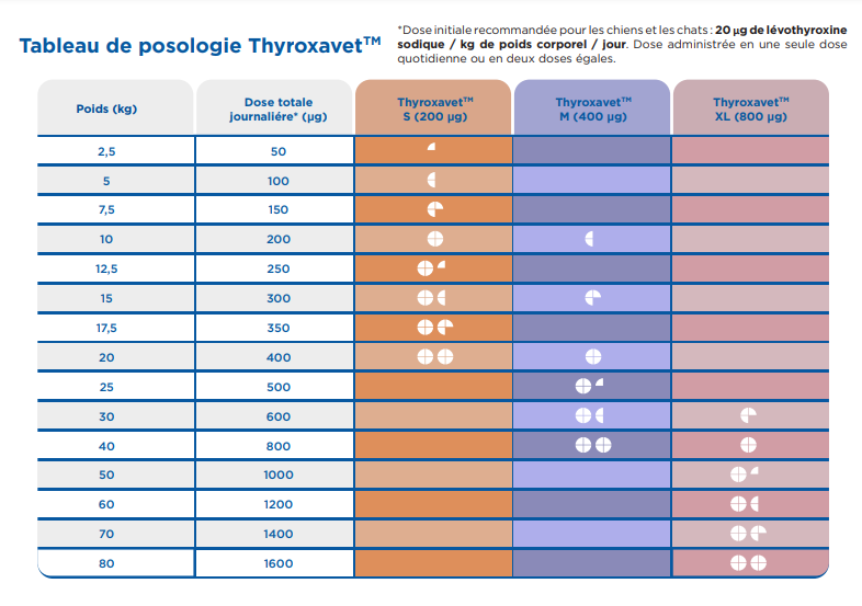 En raison de la variabilité de l’absorption et du métabolisme, il peut être nécessaire de modifier la posologie avant qu’une réponse clinique complète ne soit observée. La dose initiale et la fréquence d’administration ne constituent qu’une indication de base. Le traitement doit en effet être extrêmement individualisé et adapté aux besoins de chaque animal, en particulier pour les chats et les petits chiens. (Voir également rubrique «Précautions particulières d’emploi» en cas d’utilisation chez des animaux pesant moins de 2,5 kg (THYROXAVET™ S), moins de 5 kg (THYROXAVET™ M) et moins de 10 kg (THYROXAVET™ XL). La dose doit être ajustée en fonction de la réponse clinique et des taux de thyroxine plasmatique.