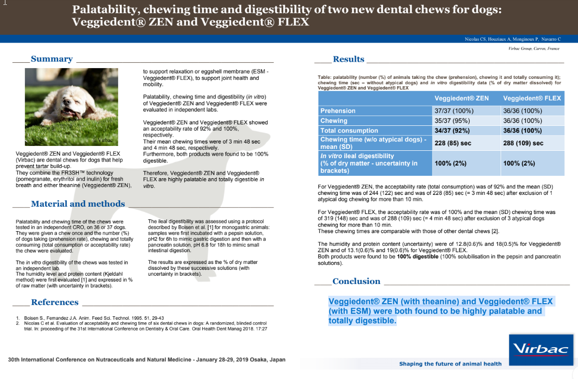 Poster 2019 - Palatability, chewing time and digestibility of two new dental chews for dogs: Veggiedent® ZEN and Veggiedent® FLEX. Proceedings of the 30th International conference on Nutraceuticals and Natural Medicine. J Nutr Food Sci 2019, 9: 36
