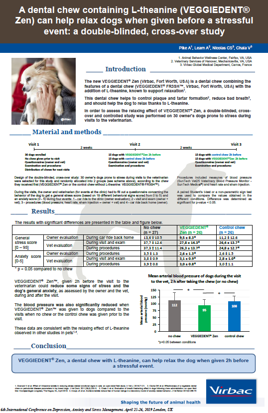 Poster 2019 - A dental chew containing L-theanine (VEGGIEDENT® Zen) can help relax dogs when given before a stressful event: a double-blinded, cross-over study