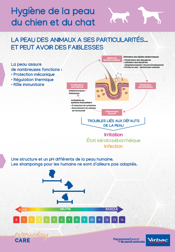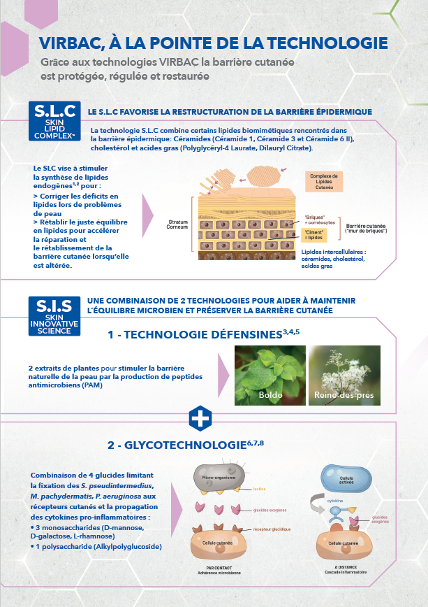 Il y a 35 ans, Virbac a été le premier à commercialiser un shampoing vétérinaire en France. Depuis ses débuts en dermatologie, le laboratoire innove et utilise des technologies à l’efficacité prouvée pour prendre en charge tout un panel de types de peau et de troubles dermatologiques.