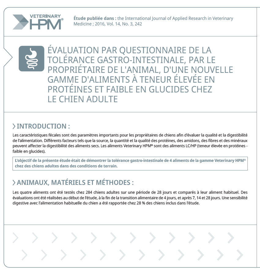 > Evaluation par questionnaire de la tolérance gastro-intestinale, par le propriétaire de l'animal, d'une nouvelle gamme d'aliments à teneur élevée en protéines et faible en glucides chez le chien adulte
