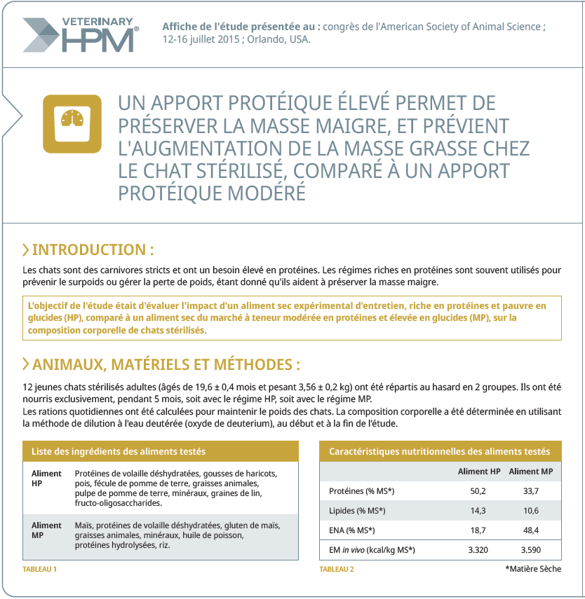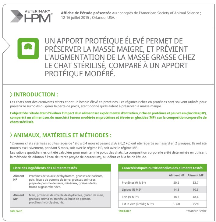 Etude 2015 - Un apport protéique élevé permet de préserver la masse maigre et prévient l’augmentation de la masse grasse chez le chat stérilisé, comparé à un apport protéique modéré.
