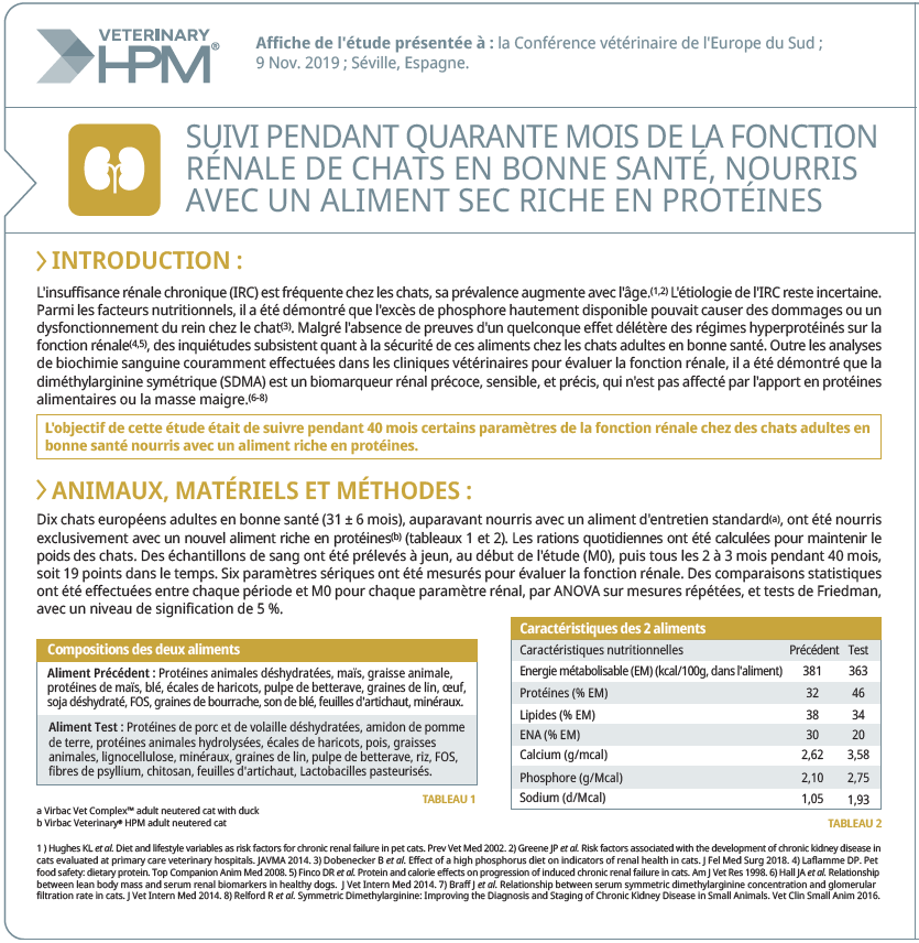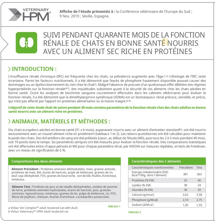 Etude 2019 - Suivi pendant 2 ans de la fonction rénale de chats en bonne santé nourris avec un aliment sec riche en protéines
