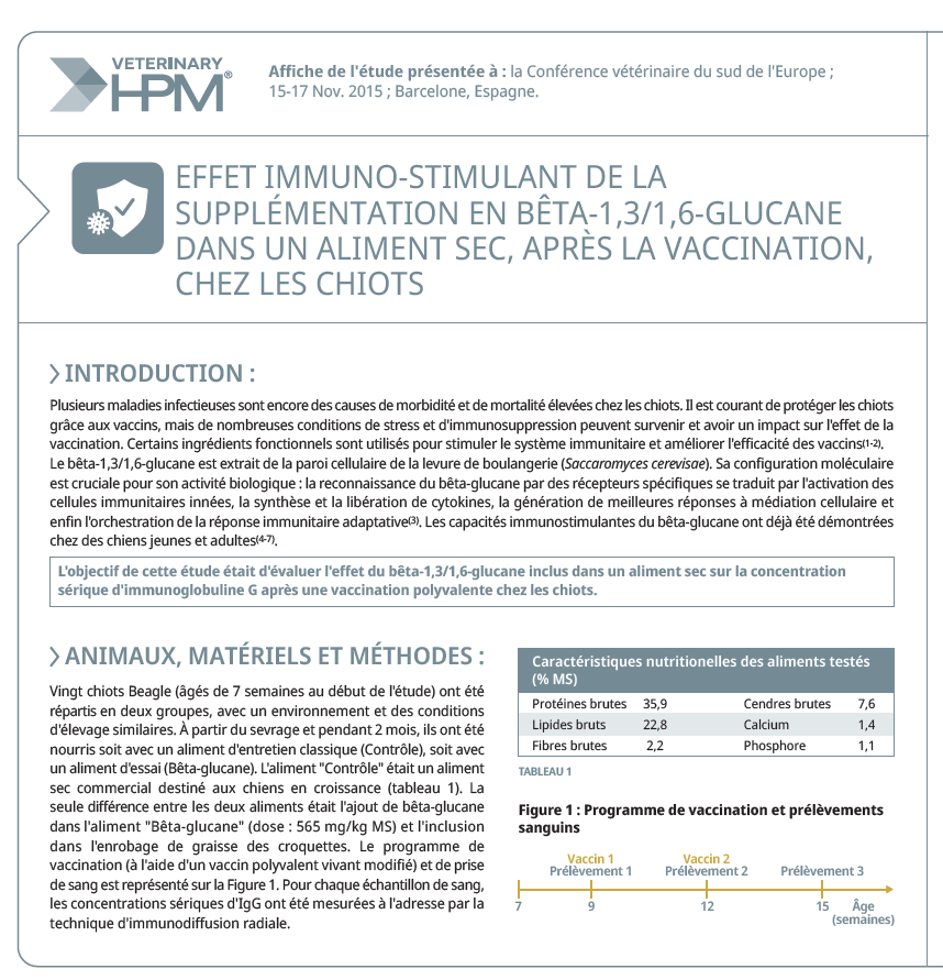 1 Leriche et al. Immunostimulatory effect of beta-1,3/1,6-glucan supplementation in a dry diet after vaccination in puppies. SEVC Congress 2015.