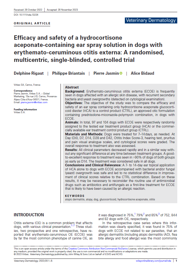 1. Bensignor E, Legeay D, Médaille C. Prospective study on otitis externa in the adult dog in France. Prat Med Chir Anim Comp. 2000; 35:405-414. Étude prospective réalisée sur 498 chiens en France entre novembre et décembre 1999.