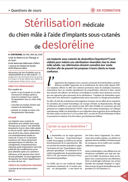 Et si la castration chirurgicale, forcément irréversible, n'était pas toujours la bonne solution ? Chaque praticien sait que la castration ne modifie pas toujours le comportement du chien dans le sens souhaité et plusieurs publications indiquent qu'elle pourrait parfois avoir des effets délétères sur la santé du chien, surtout dans certaines races3,4. Pour éviter que le propriétaire ne soit ultérieurement décu, il est donc recommandé de prendre le temps de discuter de ses motivations et des conséquences potentielles de l'opération.